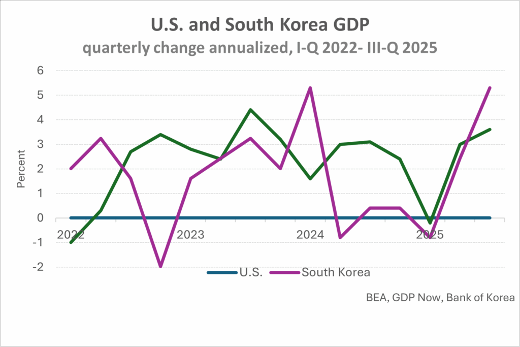 Both economies continued to accelerate from poor conditions early in the year, belying forecasts that had predicted slower growth or even recession given the tariff turbulence. The recovery has advanced South Korean GDP 1.7 percent above its third quarter 2024 level, while the United States is up about 2.6 percent, both above their recent trend of growth.
