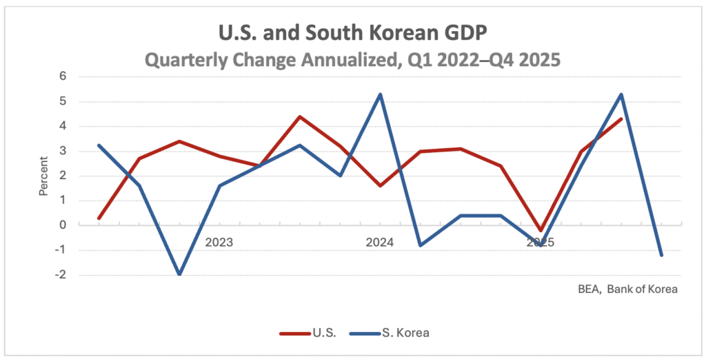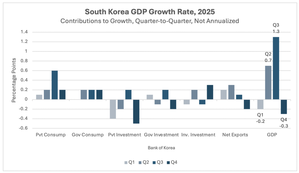 South Korea’s GDP declined 0.3 percent in the fourth quarter, a surprising result after earlier expectations of 0.1 percent growth. Buoyed by a strong third quarter, Bank of Korea (BOK) data shows that GDP was still 1.5 percent above fourth quarter growth in 2024. On a seasonally adjusted annualized basis—a measure familiar to American audiences—and which best characterizes current conditions, GDP fell at about an annualized rate of 1.2 percent.