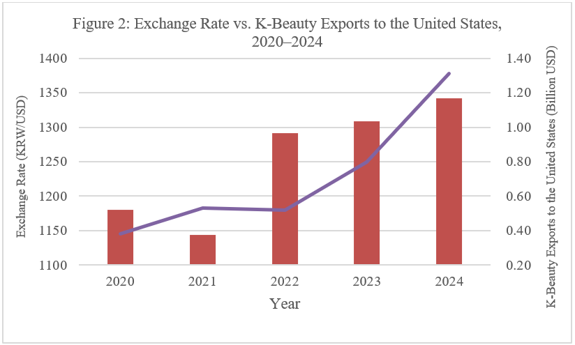 Between 2020 and 2024, the exchange rate of the Korean won against the U.S. dollar increased from 1,180 to 1,342, reflecting sustained depreciation of the won. Over the same period, Korean cosmetics exports to the United States expanded from USD 381 million to over USD 1.3 billion, a more than threefold increase. While this growth is partly attributable to rising consumer demand and brand recognition, the timeline closely aligns with the weakening of the Korean won—effectively making Korean products more price-competitive in dollar-denominated markets.