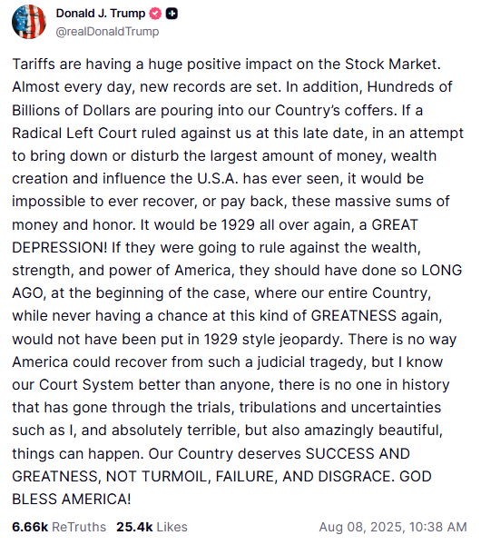 President Trump’s Truth Social post from August 8, indicating that it would be “1929 all over again” should the courts invalidate the IEEPA tariffs.