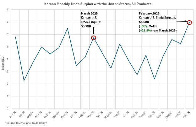 According to the International Trade Centre, Korea’s trade surplus with the United States stood at USD 49.54 billion in 2025—an 11.5 percent reduction from the previous year. Its annual goods exports to the United States were down 3.9 percent in 2025, while its U.S. imports were up 1.7 percent from USD 72.5 to USD 73.7 billion—suggesting this was mostly due to weaker exports to the United States. Although the 11.5 percent annual deficit reduction may lend some weight to the tariffs’ favor, it is difficult to determine whether these reductions occurred solely because of the imposition of tariffs.