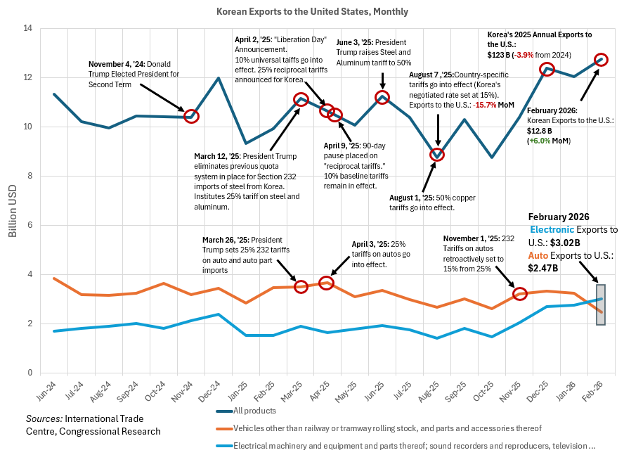 U.S. global trade has shifted considerably since Trump’s executive order on April 2, 2025, which invoked the International Emergency Economic Powers Act (IEEPA) to impose universal and “reciprocal” tariffs aimed at correcting trade deficits and reshoring U.S. manufacturing. Following temporary halts of reciprocal tariffs and negotiations, the Supreme Court struck down Trump’s tariffs in a 6–3 ruling earlier this year, reaffirming a 10 percent tariff authority to Section 122 tariffs for the time being (intended by the president to be 15 percent). Meanwhile, Section 232 tariffs on autos remain unaffected by the ruling, and anticipated tariffs against industries such as semiconductors are not yet in place (the president’s January proclamation on semiconductors does not appear to specifically target Korean companies).