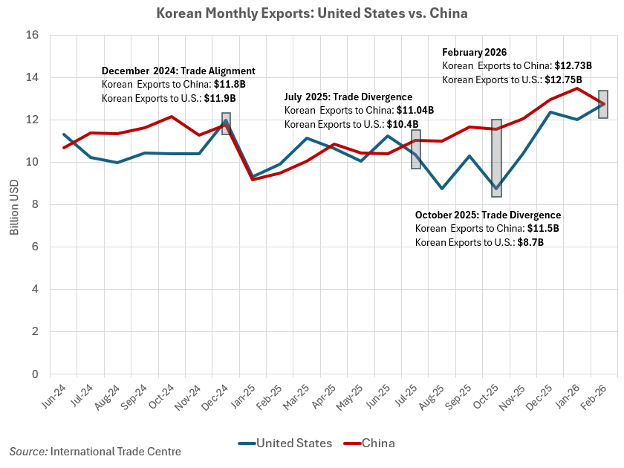 Korea’s exports to the United States have since rebounded, putting exports to China at roughly the same level, at USD 12.75 billion and USD 12.73 billion, respectively, in February 2026. The divergence once tariffs went into effect and the subsequent convergence following the U.S.-Korea trade deal suggest that tariffs on Korean goods in the U.S. market may have affected trade in this regard.