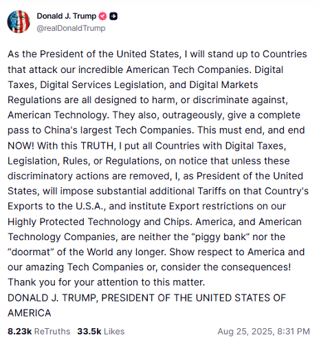 President Trump’s Truth Social post on August 25 announcing tariffs on countries that “discriminate against American Technology.”